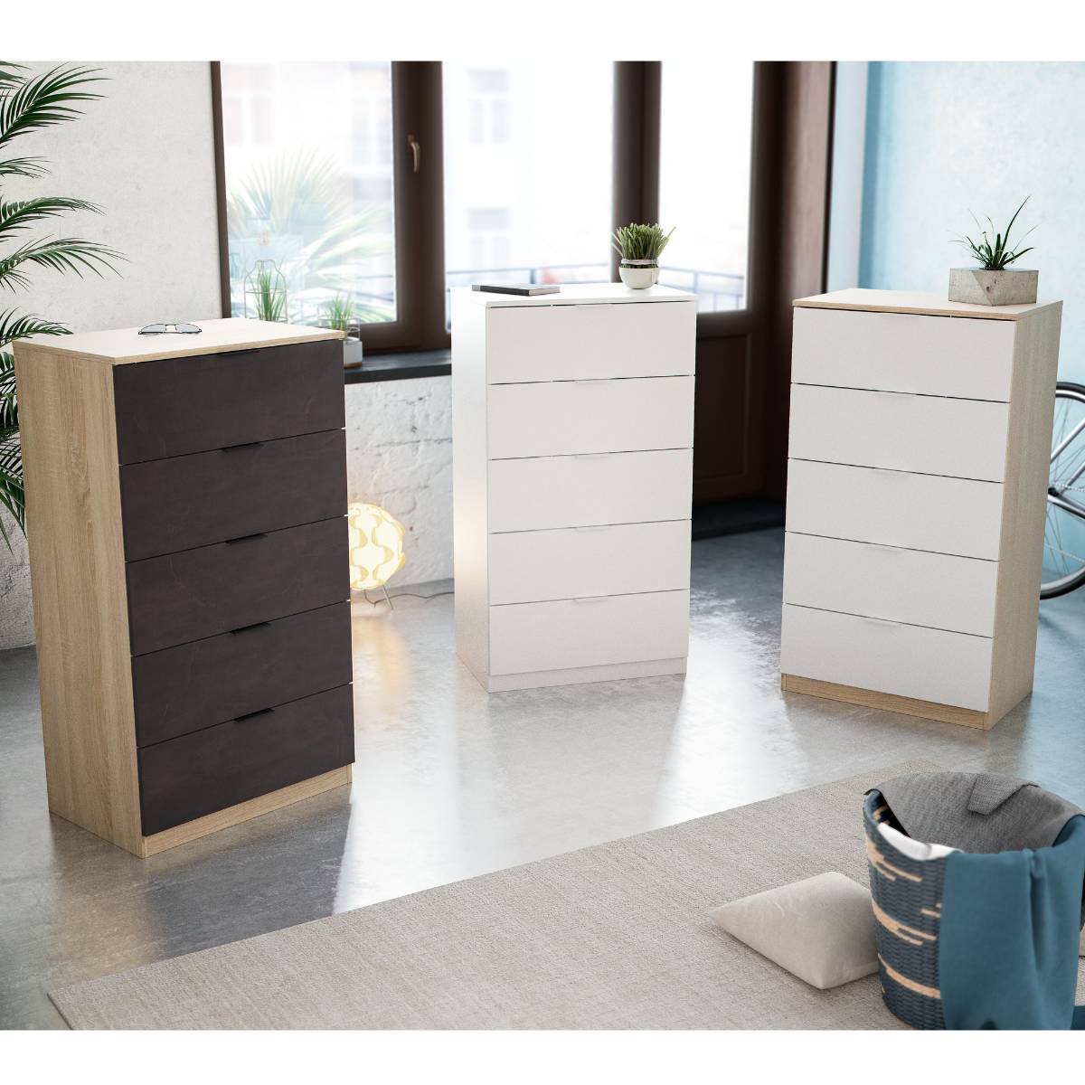 Las cómodas nórdicas son blancas, con acabado en madera. También pueden tener un acabado en color artic, derivando al gris e incluso grafito para crear bellos contrastes. Sus patas son escandinavas y disponen de unos cinco cajones apilados.