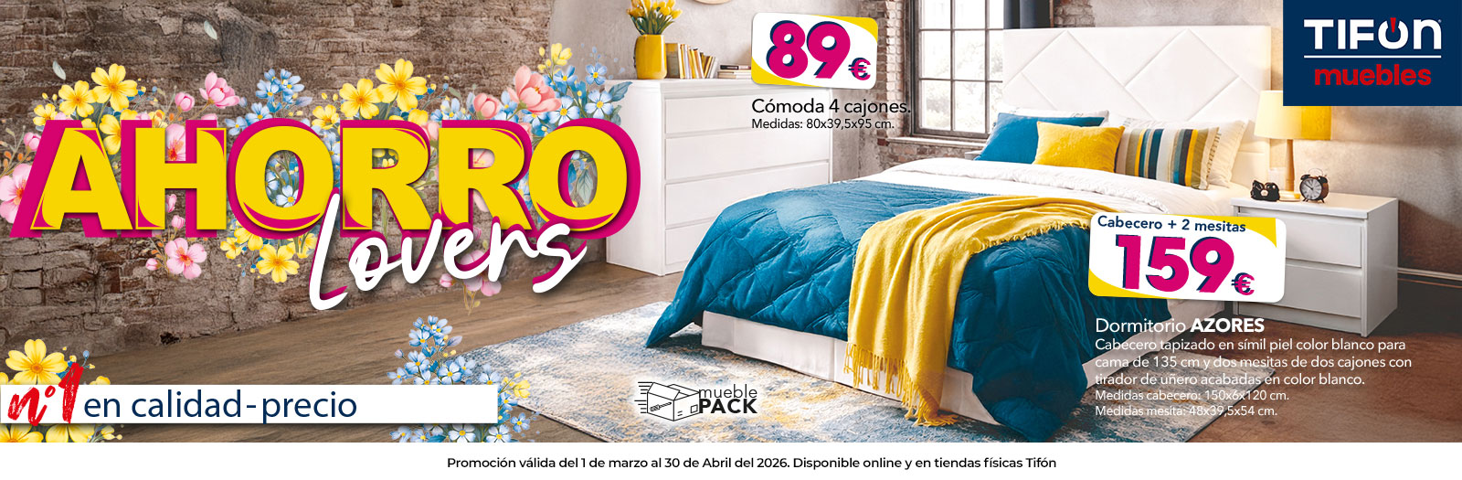 *Promoción válida del 01/03/2026 al 30/04/2026 en tiendas físicas Tifón y en tifon.es Aplicable a productos seleccionados incluidos en la campaña Ahorro Lovers Primavera 2026, identificados en folleto y soportes promocionales en tienda y web. Los precios y condiciones podrán variar según modelo, medidas, acabados o disponibilidad de stock. No acumulable a otras promociones, descuentos adicionales o condiciones especiales salvo indicación expresa. La empresa se reserva el derecho a modificar o cancelar la promoción por causas justificadas. Consulta condiciones específicas en tu tienda Tifón habitual.